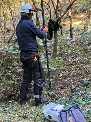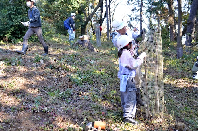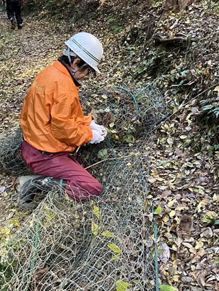 11月26日(水)越生町「梅園小学校林業体験授業」支援、つるきり、しかよけ網補修